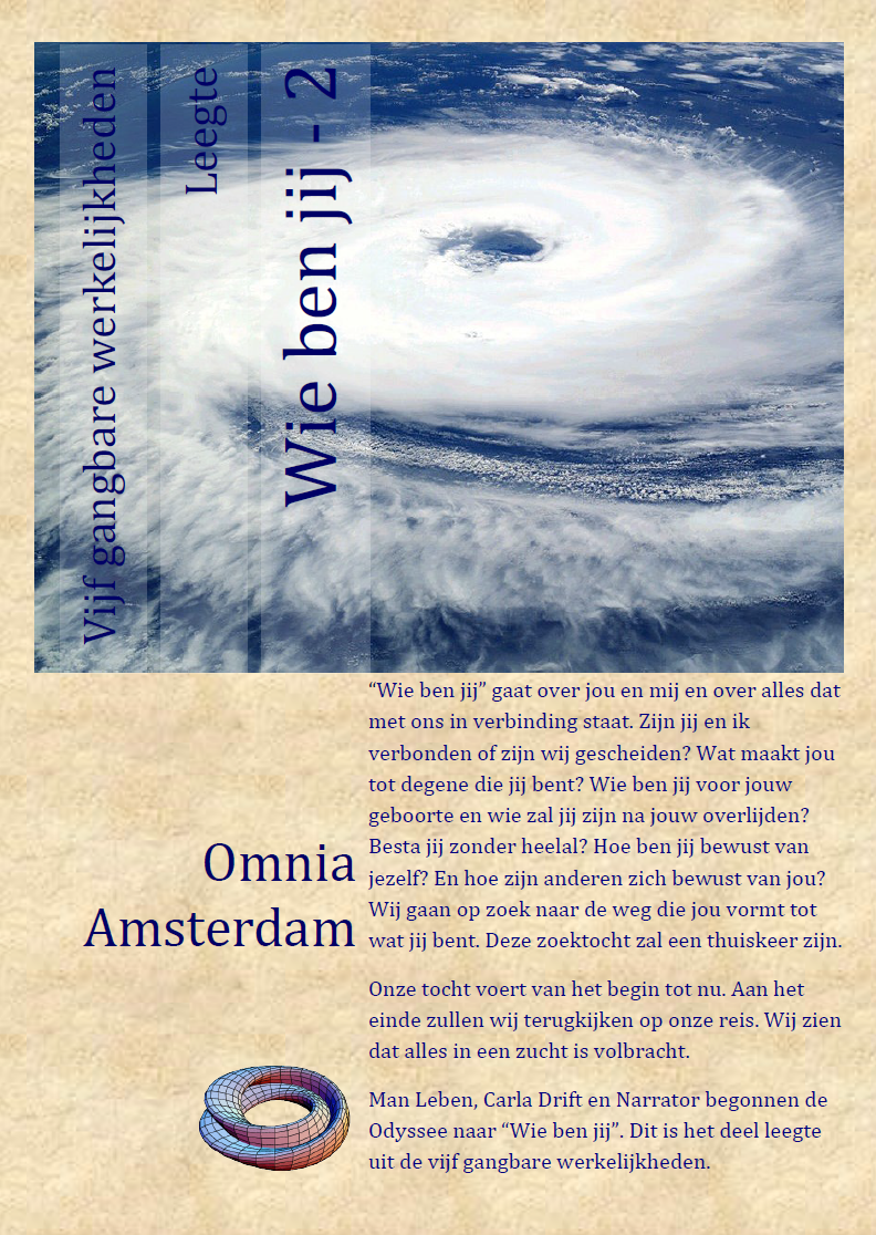 De Odyssee naar “Wie ben jij – een verkenning van ons bestaan” is een queeste met vele aanlegplaatsen. De zoektocht naar “Wie ben jij” is over jou en mij en alles dat met ons verbonden is. Niets is op voorhand uitgesloten. Zijn jij en ik verbonden of zijn wij gescheiden? Wat maakt jou tot de persoon die jij bent? Wie ben jij voor jouw geboorte en wie zal jij zijn na jouw dood? De antwoorden op deze vragen zijn voorlopig onbekend, maar toch
